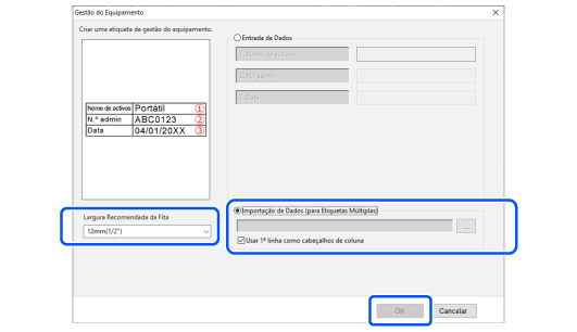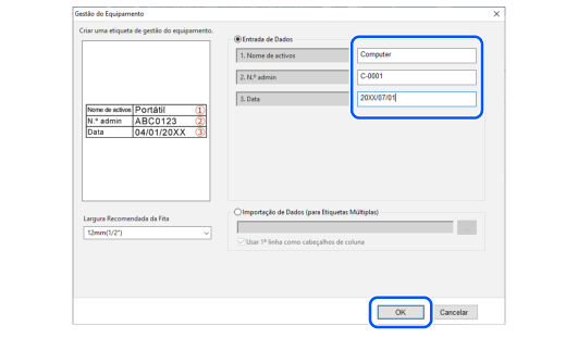 Nota:Quando pretender criar várias etiquetas, deixe os campos de entrada em branco e faça clique em OK. Pode introduzir dados de forma fácil na Janela Criação de dados. |