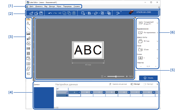 Окно создания данных Позволяет вводить и изменять содержимое этикеток, вставляемых в Окно редактирования макета. Если это окно скрыто, нажмите кнопку |