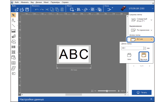 По умолчанию длина этикетки изменяется автоматически в соответствии с объектами, добавленными на этикетку в окне Окно редактирования макета. Далее описано, как можно задать длину этикетки вручную.