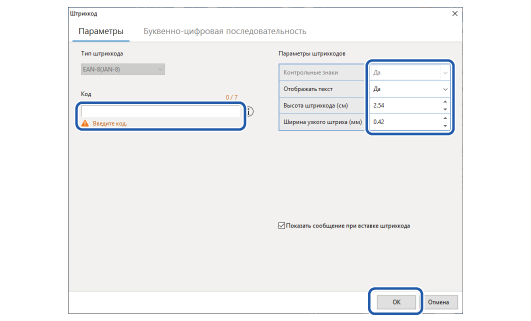 Примечание.При нажатии любой из этих кнопок откроется окно настроек для ранее выбранного типа штрихкода или QR-кода. Нажмите кнопку