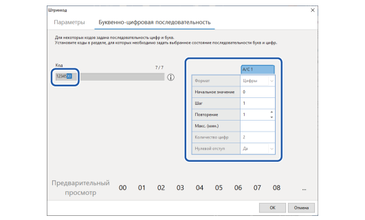 В окне Буквенно-цифровая последовательность укажите диапазон для последовательного изменения кода, задайте начальное значение и прочие настройки.
