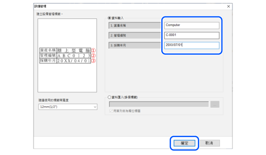 註:建立多個標籤時,請將輸入欄位留空,然後按一下確定。您可以在資料新增視窗中輕鬆輸入資料。 |
