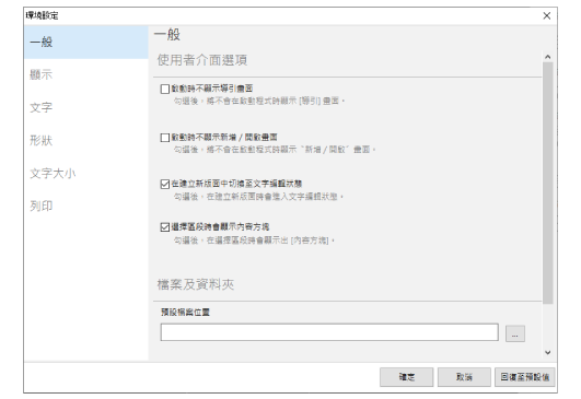 偏好設定可讓您顯示或隱藏某些視窗,並更改顯示、字型、形狀和列印設定的預設設定。