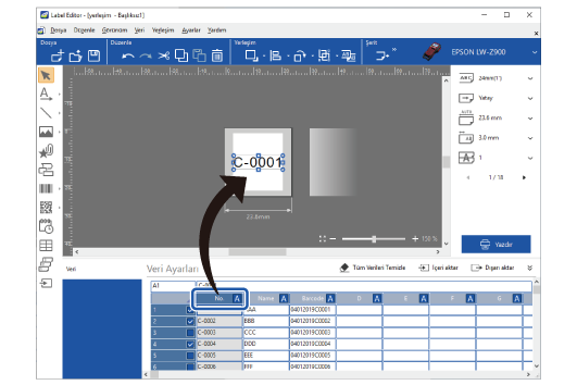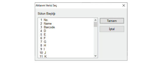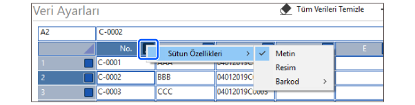 Bir dosya içe aktarıldığında, tüm sütunların niteliği Metin olarak ayarlanır. Barkod veya QR kod verileri veya resimler (resim dosyalarının tam yol adları) içeren sütunların özniteliğini değiştirmeniz gerekir.