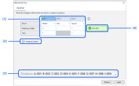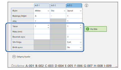 Gelişmiş ayarları yapmak için buna tıklayın. Örnek etiketler oluşturmak için A/D 3 sütunundaki ayarları aşağıda gösterildiği gibi değiştirin.