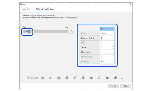 Alfanümerik Sıra penceresinde, serileştirilecek kodda bir aralık belirtin ve başlangıç değerini ve diğer ayarları ayarlayın.