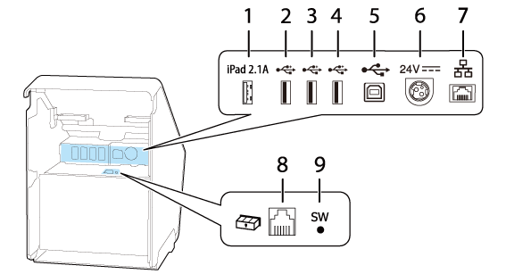 オプションの無線LANユニットやカスタマーディスプレイ、ハンディスキャナーなど周辺機器のUSBケーブルを接続します。 |