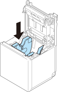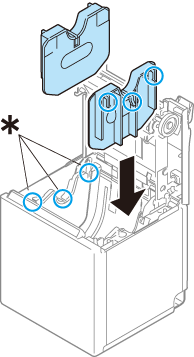 Įtaisykite tris ritininio popieriaus kreiptuvų iškyšas į spausdintuve esančias stačiakampes skyles (*), tada užspauskite.