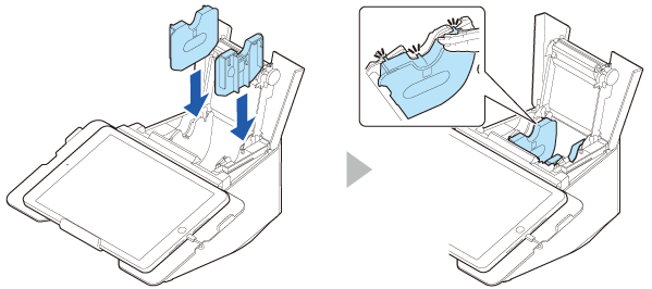 Širinu papira možete promijeniti s 80 na 58 mm ugradnjom priloženih vodilica za papir u roli širine 58 mm. Za promjenu širine papira slijedite korake u nastavku.