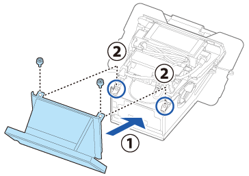 Helyezze fel az OT-DM30SL kijelzőt úgy, hogy a kampóját beakasztja a nyomtatóban lévő lyukba, majd rögzítse a csavarokkal.