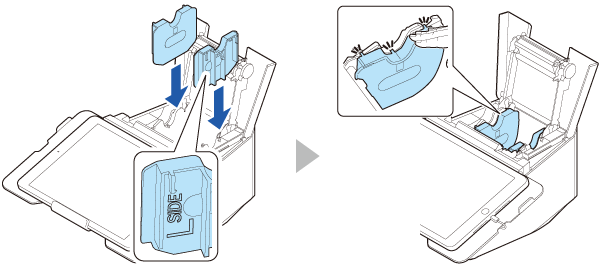 ロール紙ガイドの3 箇所の突起をプリンターの角穴に合わせ、押し込みます。