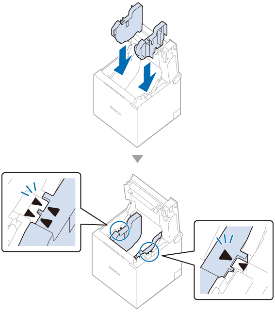 Може да ја промените ширината на хартијата од 80 на 58 mm преку поставување на доставените шини за ролна хартија со ширина од 58-mm. Следете ги чекорите подолу за да ја смените ширината на хартијата.