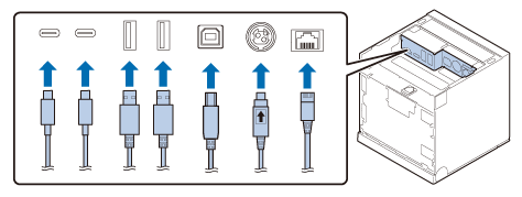 Поврзете го AC-адаптерот и кабелот за интерфејс со приклучоците на дното од печатачот.