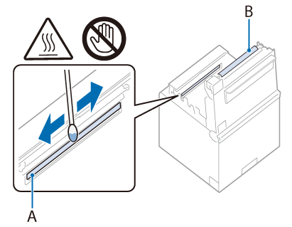 3. サーマルヘッドはアルコール溶剤(エタノールまたはイソプロピルアルコール)を含ませた綿棒で、プラテンローラーは軽く水を含ませた綿棒で、汚れを取り除きます。