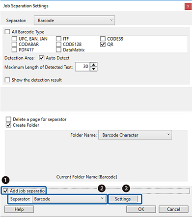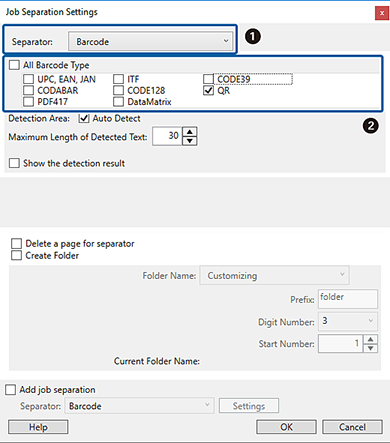 Dette afsnit forklarer jobindstillingerne til "Oprettelse af en mappe ved hjælp af oplysningerne fra den første stregkode og derefter oprettelse en mappe på et lavere niveau i mappetræet ved hjælp af oplysningerne fra den anden stregkode".