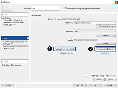 Dette afsnit forklarer jobindstillingerne for "Opdeling af et dokument med blanke sider og gemme som PDF-filer", når en blank side er placeret mellem det tredje og fjerde stykke papir.