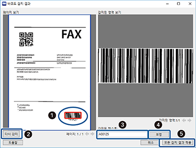 바코드 텍스트가 올바르게 인식되었는지 확인하려면 감지 결과 표시를 선택합니다. 스캔 후 표시되는 화면에서 인식된 영역과 텍스트를 확인할 수 있습니다. 영역 (