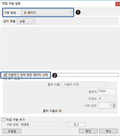 감지 레벨에서 높음, 보통, 또는 낮음에서 감지 레벨을 선택할 수 있습니다. 레벨이 높으면 표시되는 밝은 색상 문서 및 문서가 빈 페이지로 감지됩니다.