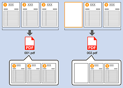 스캔된 문서의 페이지 사이에 빈 용지를 놓으면 스캔한 데이터를 나눠서 별도의 파일이나 폴더에 저장할 수 있습니다. 문서의 양면을 스캔할 때 그 중 한면이 비어 있으면 빈 페이지로 감지됩니다. 분류 후에 불필요한 페이지를 제거한 다음 저장할 수 있습니다.