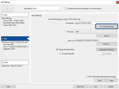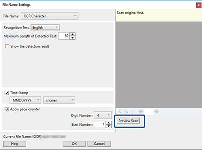 Med OCR (en funksjon for oppdagelse av tekst i skannede bilder, og konvertering til lesbar tekst), kan du lese av teksten fra det spesifiserte området, og deretter lagre filer med filnavn som bruker den gjenkjente teksten.