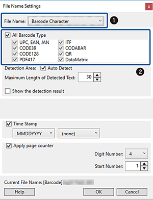 Den avleste strekkodeinformasjonen angis i [Barcode] fra Gjeldende filnavn. Hvis du bare ønsker å bruke strekkodeinformasjonen for filnavnet, tømmer du Tidsstempel og Bruk sidetall.