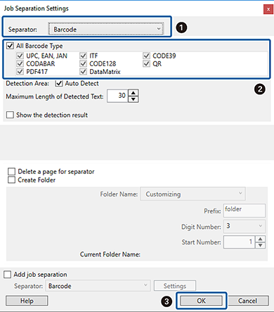 Dette avsnittet forklarer jobbinnstillingene for «Sortering via strekkode og lagre filer med filnavn med tekstinformasjonen i strekkoden».