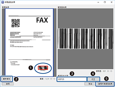 選取 [顯示偵測結果] 以檢查是否可正確辨識條碼文字。在掃描之後顯示的畫面上,您可以檢查已辨識的區域與文字。您也可以重新指定區域 (
