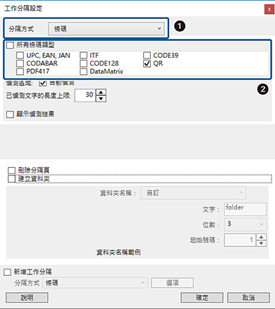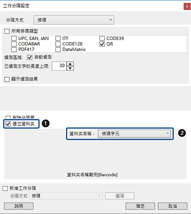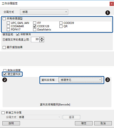 本節說明「使用第一個條碼資訊建立資料夾,然後使用另一個條碼資訊於資料夾樹狀結構中的較下層級建立資料夾」的工作設定。