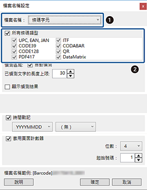讀取條碼資訊在 [檔案名稱範例] 的 [Barcode] 中輸入。如果您只想要針對檔案名稱使用條碼資訊,請清除 [時間戳記] 與 [套用頁面計數器]。