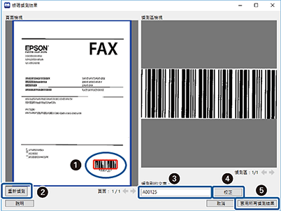 選取 [顯示偵測結果] 以檢查是否可正確辨識條碼文字。在掃描之後顯示的畫面上,您可以檢查已辨識的區域與文字。您也可以重新指定區域 (