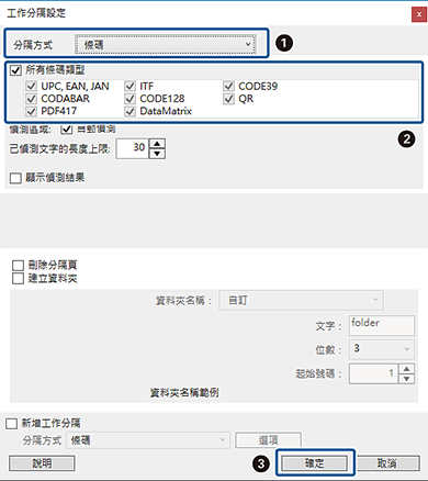 使用條碼資訊,您可以依照偵測到條碼的每一頁分隔檔案,且可使用條碼中的文字資訊建立及儲存檔案。