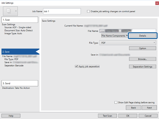 لتحديد الرمز الشريطي أو OCR من مكونات اسم الملف, عيِّن الإعداد من التفاصيل ثم حدده.