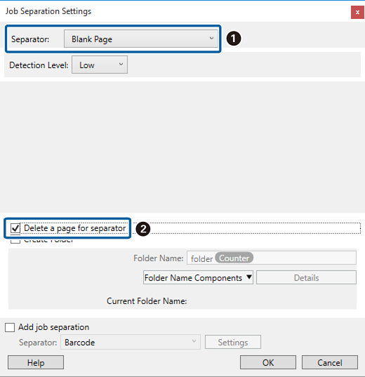 في مستوى الاكتشاف، يُمكنك تحديد مستوى الكشف من مرتفعة، أو متوسطة، أو منخفضة. عندما يكون المستوى عاليًا، يتم الكشف عن المستندات ذات اللون الفاتح والمستندات الشفافة كصفحات فارغة.