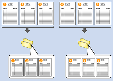 Jelikož formáty (soubory obrázků, například formátJPEG) nepodporují uložení více stránek, nelze vytvořit soubory svíce stránkami. Pokud je zaškrtnuto políčko Vytvořit složku, bude dokument rozdělen podle určeného počtu stránek (počtu souborů) a poté bude uložen do složky.