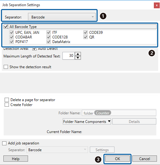 Chcete-li vybrat Čárový kód nebo OCR z Součásti názvu souboru, proveďte nastavení z Podrobnosti a potom jej vyberte.