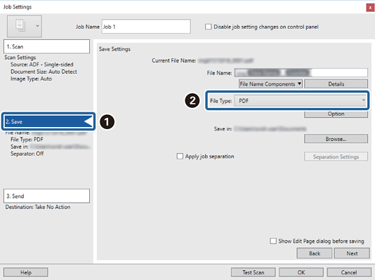 Vtéto části je vysvětleno nastavení úlohy pro rozdělení dokumentu pomocí prázdných stránek a uložení souborůPDF, pokud je mezi třetí a čtvrtý list papíru vložena prázdná stránka.