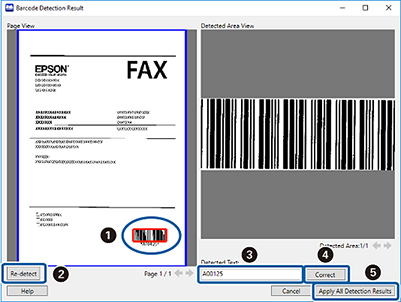 בחר הצג את תוצאת האיתור כדי לבדוק אם טקסט הברקוד זוהה נכונה או לא. במסך שיוצג אחרי הסריקה, תוכל לבדוק את האזור ואת הטקסט שזוהה. תוכל גם לציין מחדש את האזור (