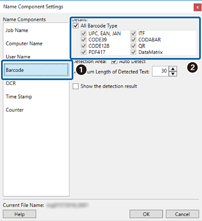 Ahhoz, hogy a Vonalkód vagy az OCR lehetőséget ki lehessen választani a Fájlnév komponensek részben, adja meg a beállítást a Részletek opciónál, majd válassza ki.