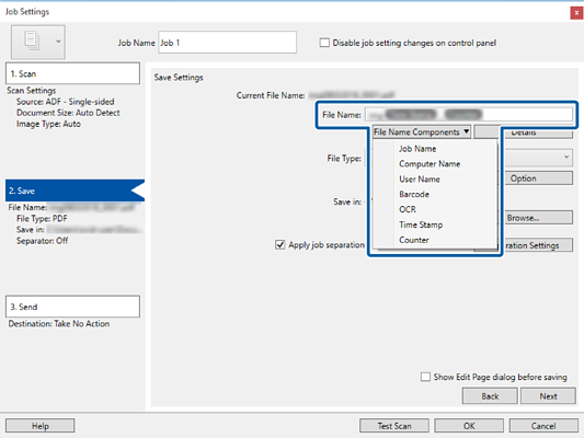 Per selezionare Codice a barre o OCR da Componenti nome file, eseguire l’impostazione da Dettagli e quindi selezionarla.