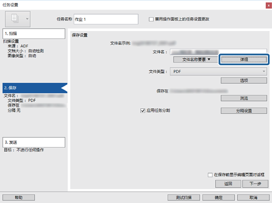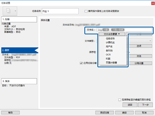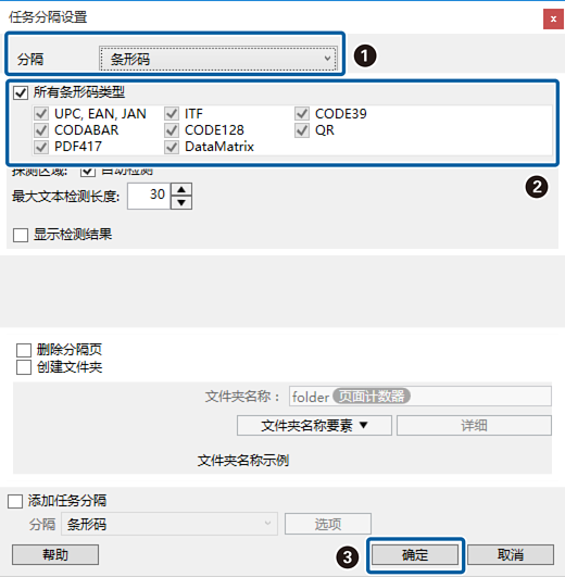 本节介绍“按条形码排序,以及使用条形码中的文本信息保存具有文件名的文件”的任务设置。