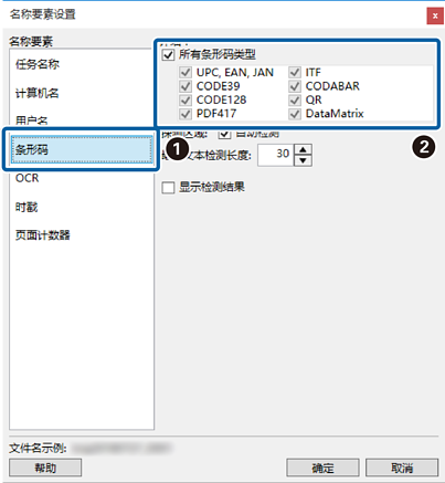 要从文件名称要素中选择条形码或 OCR,请从详细中进行设置,然后进行选择。