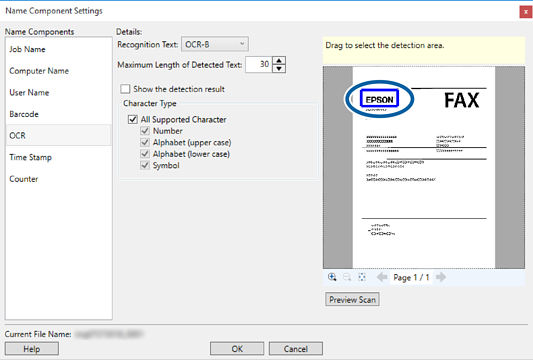Välj OCR från Filnamnkomponenter och lägg sedan till i Filnamn.