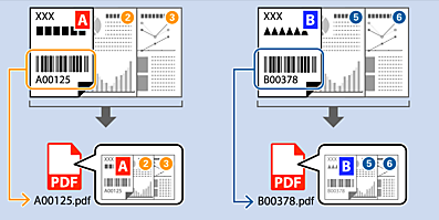 Med streckkodsinformation kan du dela filer med varje sida på vilken en streckkod detekteras, och skapa och spara filer med textinformationen i streckkoden.