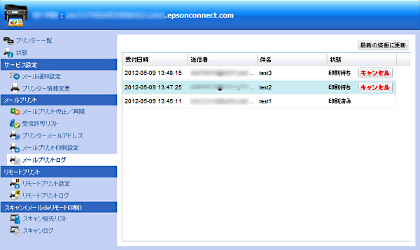 ユーザーページにアクセスして、[メールプリントログ]から印刷をキャンセルします。