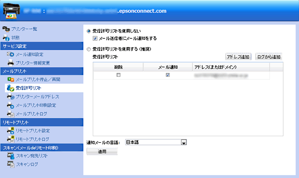 受信許可リストを使用している場合は、リストにある宛先に対して個別に設定できます。該当のアドレス(またはドメイン)の[メール通知]にチェックを入れます。