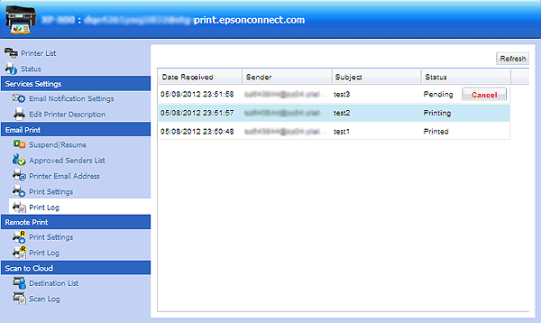 Meld u aan bij de User Page (gebruikerspagina) en annuleer de afdruktaak via het Print Log (Afdruklogboek) van Email Print.