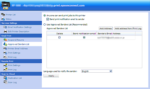 Als u de Approved Senders List (Goedgekeurde afzenders) wilt uitschakelen, selecteert u Anyone can send print jobs to this printer (Iedereen kan afdruktaken naar deze printer sturen) en klikt of tikt u vervolgens op Apply (Toepassen).