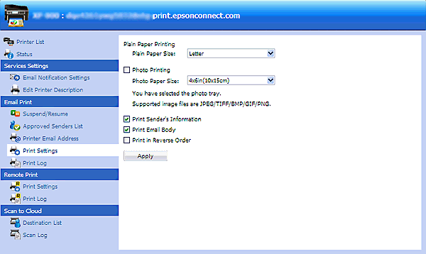 Selecteer Print Settings (Afdrukinstellingen) onder Email Print in het menu aan de linkerkant.