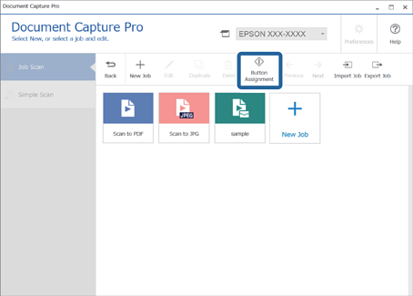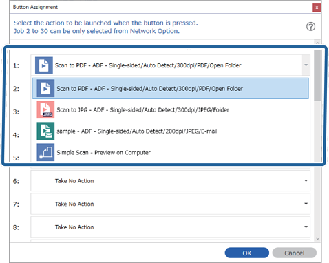Se você estiver usando o painel de interface de rede (ou unidade), você pode atribuir até 30 trabalhos aos botões. Se você está usando um scanner o qual não tem um painel de controle usando uma conexão USB, atribua o trabalho ao botão 1.