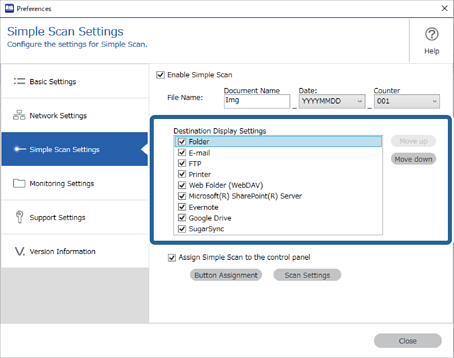 2Clique em Configurações de digitalização simples, e então desmarque os destinos que você não deseja exibir em Configurações de exibição de destino.